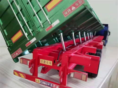 側(cè)翻車液壓油缸對于頂桿的長度還沒有中置雙頂?shù)囊话敫?,呈一字排開分布在貨廂底部。油缸的升舉力對于貨廂的剛性要求較高。設(shè)計(jì)制作時(shí)要注意滿足要求。在車輛尾部配合使用移動(dòng)支腿油缸使用可以在卸貨時(shí)避免貨物埋胎。
